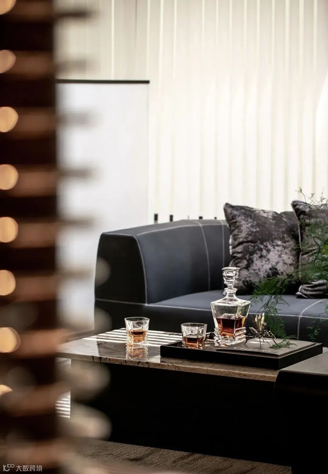 深色麂皮沙发,柔软而延展,空间硬朗的线条行到此处仿佛得以松弛。