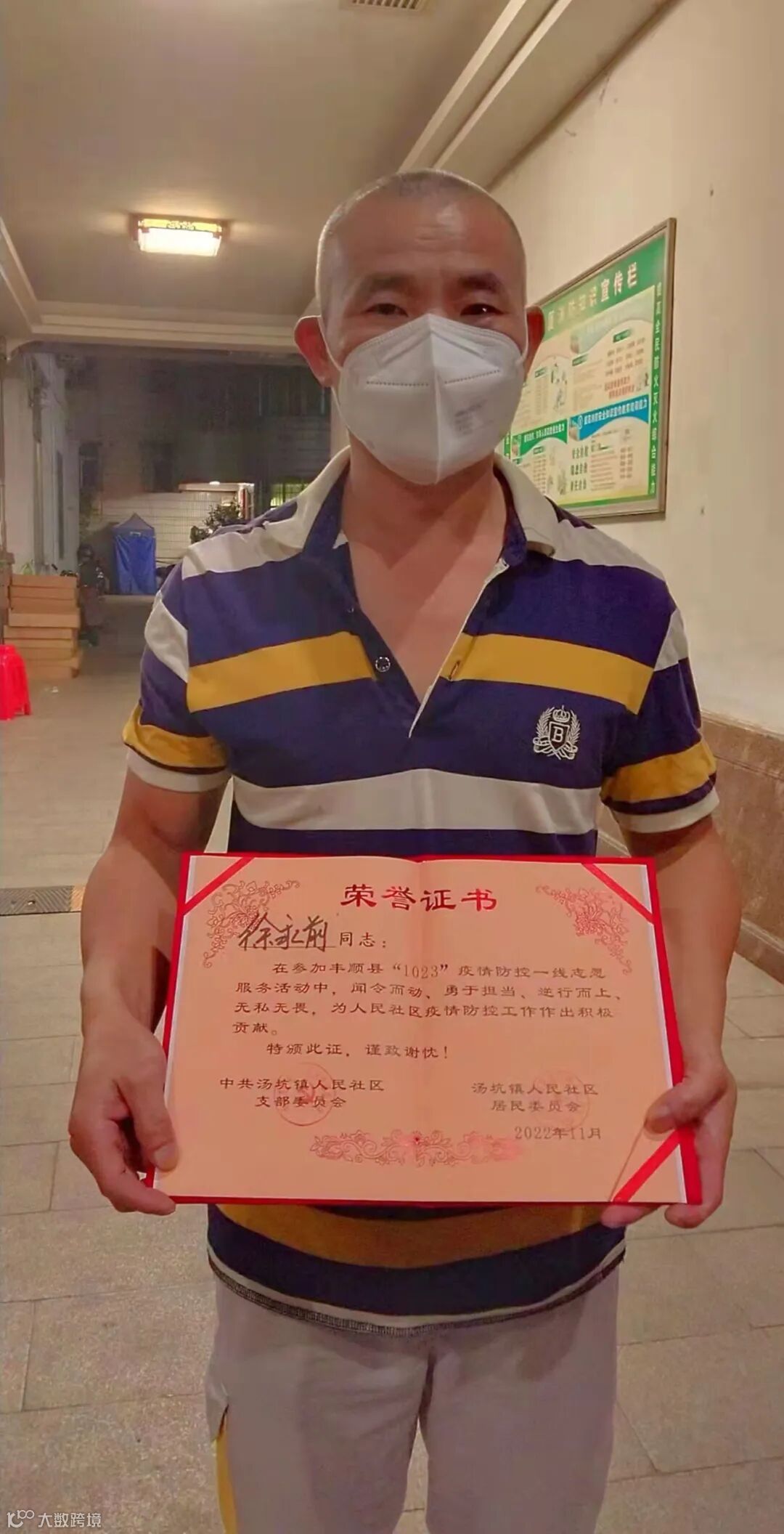 2022年11月13日,丰顺发布“丰顺县关于调整部分区域风险等级的通告(2022年第32号)”,从13日12时起,人民社区被调整为低风险地区。徐永前和战友们从人民社区党支部书记手中接过“荣誉证书”时,欣慰地说:只要我们携手并肩,就一定能打赢这场疫情防控战!
