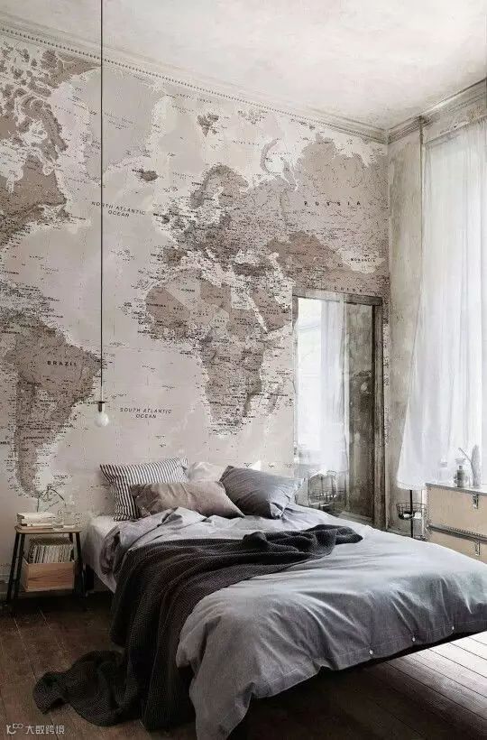 你还可以直接选择世界地图花纹的壁纸,睡在这样的卧室里,梦里都在旅行。