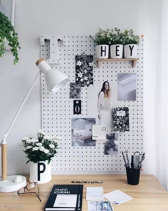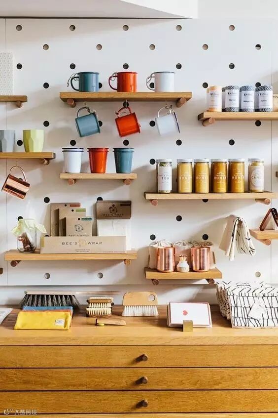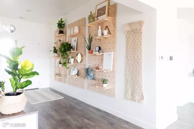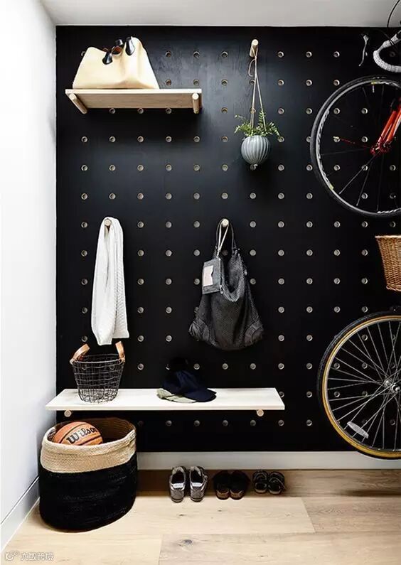 如果说有另外一样东西能与铁艺网格相媲美,那只能是洞洞板了,英文名为Pegboard,国外非常流行用它做室内装饰,因为它不仅仅是装饰,更是一件收纳神器。