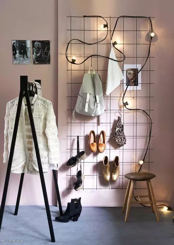 只要往墙上装上铁艺网格架,衣服、鞋子、包包都能挂,还灯泡都有地方装了。