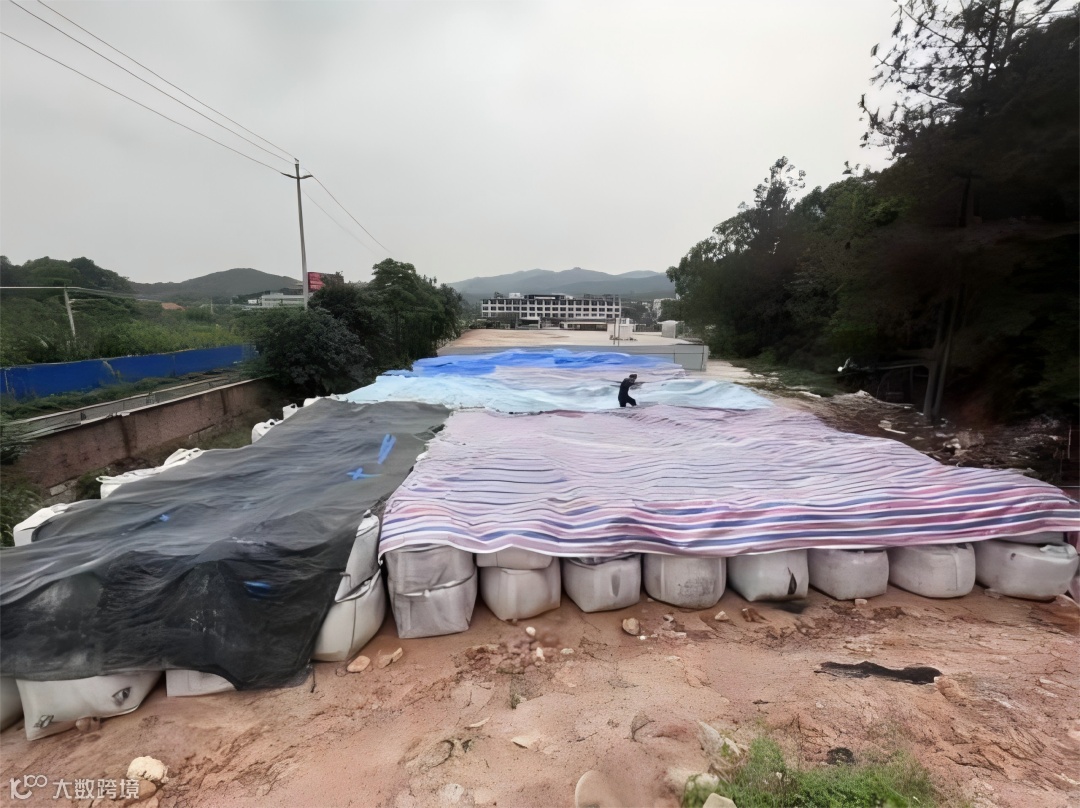 图为该公司保管场堆存危废遇水冒烟,采取应急覆膜(图片来源于广州生态环境局官方网站)