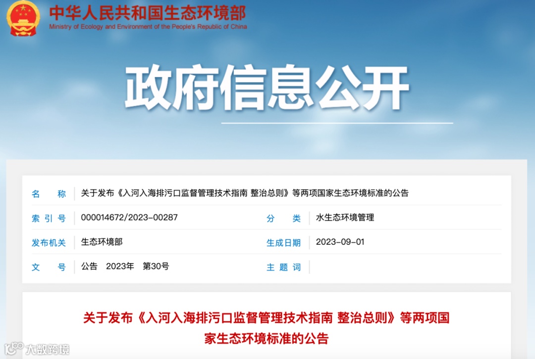2023年9月1日,生态环境部首次发布《入河入海排污口监督管理技术指南 整治总则》(以下简称《总则》)、《入河入海排污口监督管理技术指南 入河排污口规范化建设》两项国家生态环境标准,并将于2023年11月1日起实施。