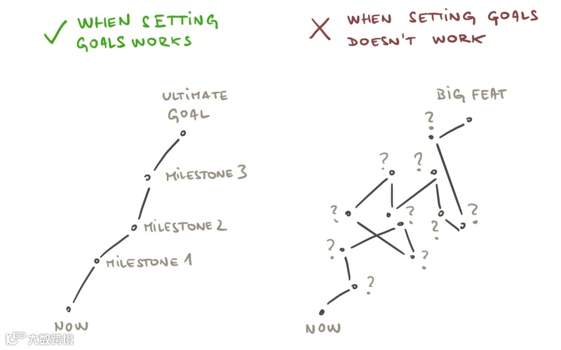 目标甚至会导致拖延症。当你制定一个远大的目标时,你不可避免地会在脑海中浮现出前行的画面,而科学表明,这个通往大目标的旅程会让你的动力一天比一天少。