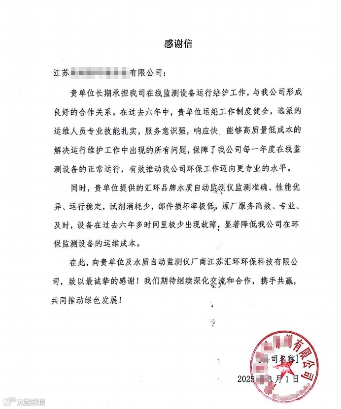 在环保事业的漫漫征程中,每一次的认可都是闪耀的里程碑,照亮我们前行的道路。近日,汇环合作商收到一封来自企业用户的感谢信,这不仅是对合作商运维服务的高度赞誉,更是对汇环水质自动监测仪的充分肯定。