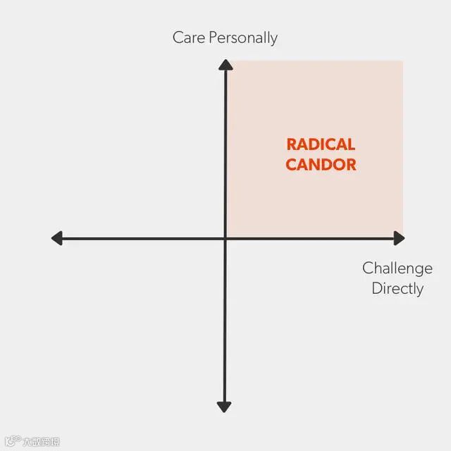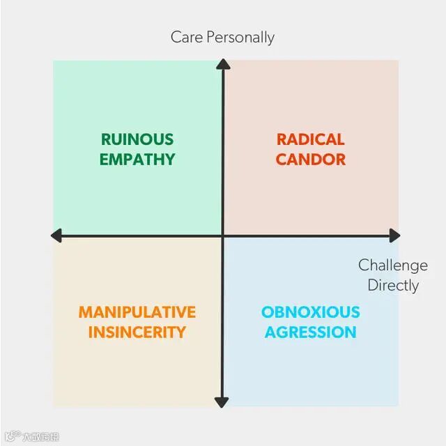 从上面的图表中可以看出,"完全坦诚 "来自于 "个人关怀 "和 "直接挑战 "的结合。完全的坦诚是非常有益的,而且它对事不对人。