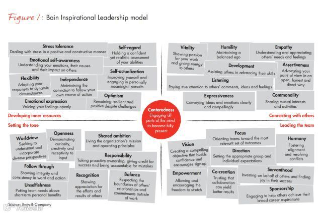 根据追随者的回答,我们进行了联合分析(典型的消费者研究),以评估激励受访者的一系列特质之间的相关性。结果是,33个特质对激励他人有统计学意义。然后,我们利用这组行为创建了 "贝恩激励型领导力模型"(图1)。