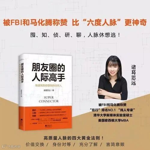 这本书的作者是诸葛思远,硕士毕业于清华大学新媒体专业,之后在密歇根大学读MBA,长期从事风险投资,亦是互联网智库“在行”咨询量最高的行家,为两千多人提供了"找人"咨询服务。她是新华社、《中国日报》《第一财经周刊》和马化腾著作《分享经济》中点名的人脉专家,对人际交往方面有很深的研究。