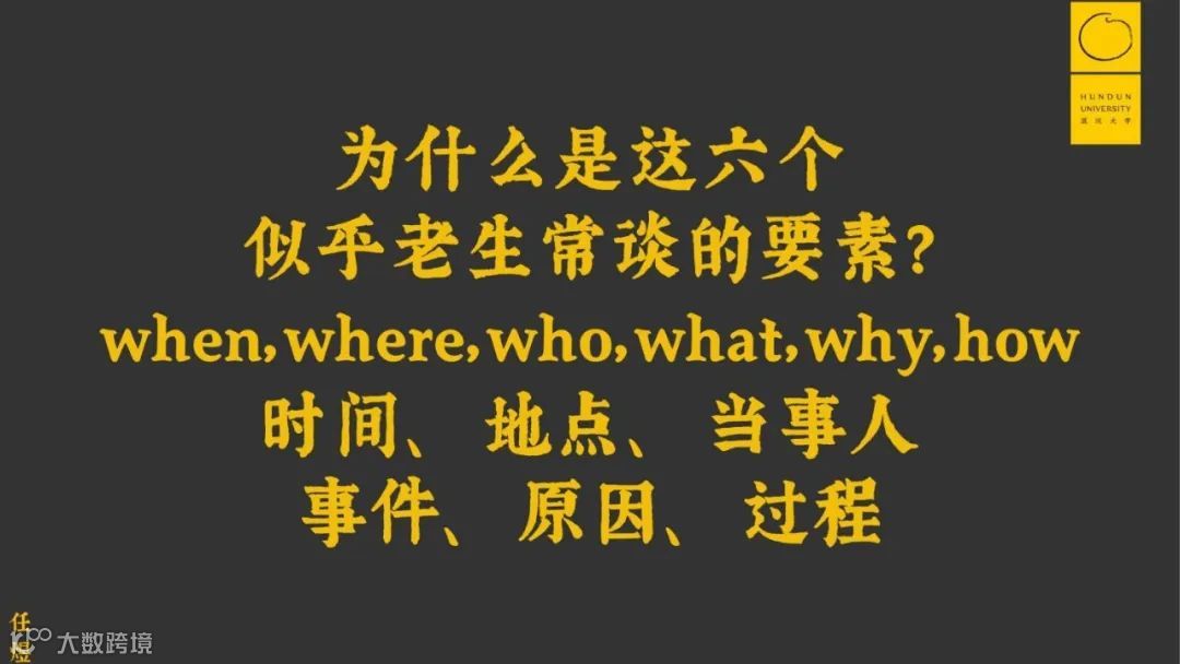 老生常谈的六个要素,时间、地点、当事人、事件、原因、过程。我原来是做媒体的,一篇好的新闻报告里必须要有这六个要素,这是媒体经过数千年经验的归纳。全面描述一件事情的最少要素就是这六个,否则事情就讲不清楚了。