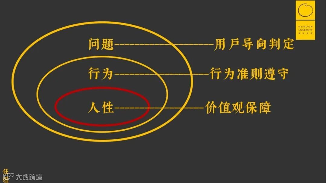 我们把人性、行为和问题这三点做一个延伸。第一点,人性的问题是对价值观的梳理,针对人性,尊重人性,而不是反着人性来,这个是用价值观来保障的。第二点,当有了价值观保障,人性处于透明公开的阳光下,这时企业制定、倡导的行为准则,大家才有可能去遵守。第三点,最终问题的解决,要以用户导向做判定。