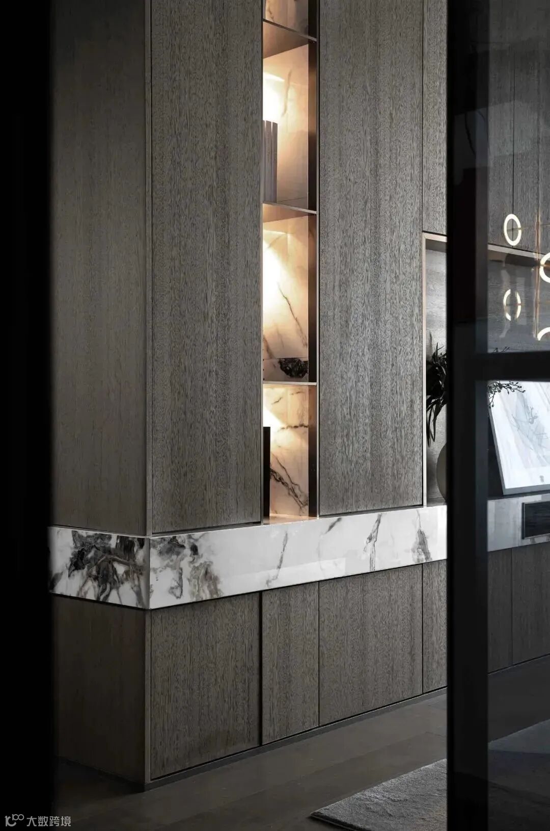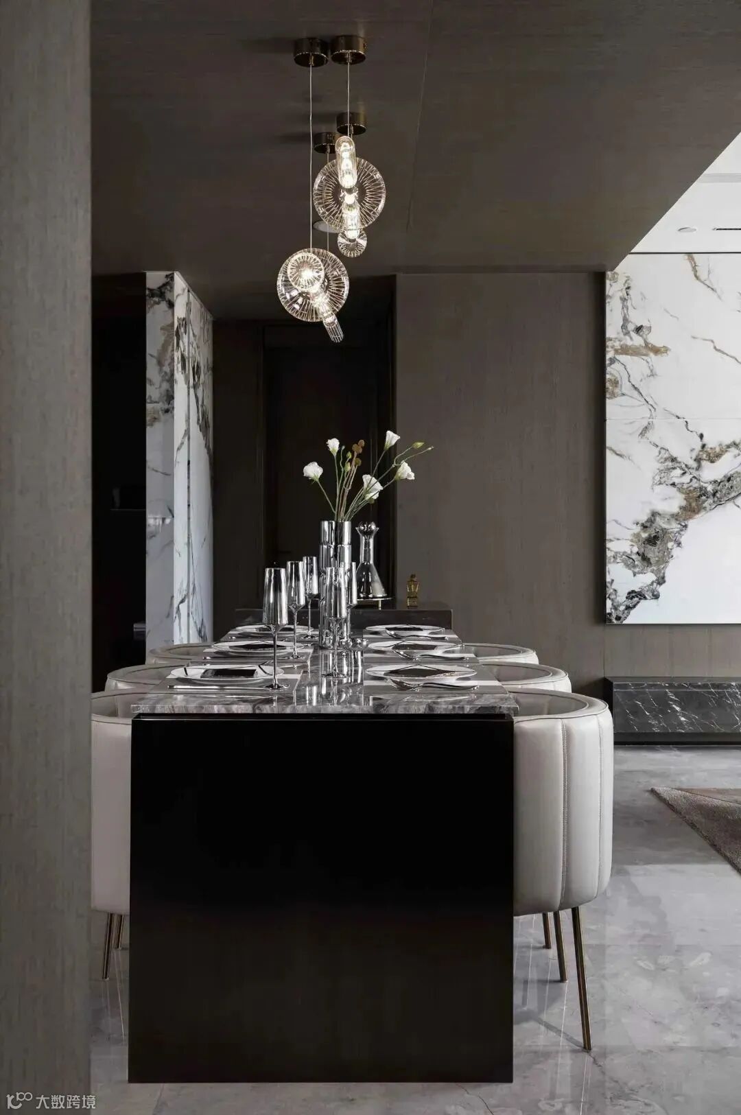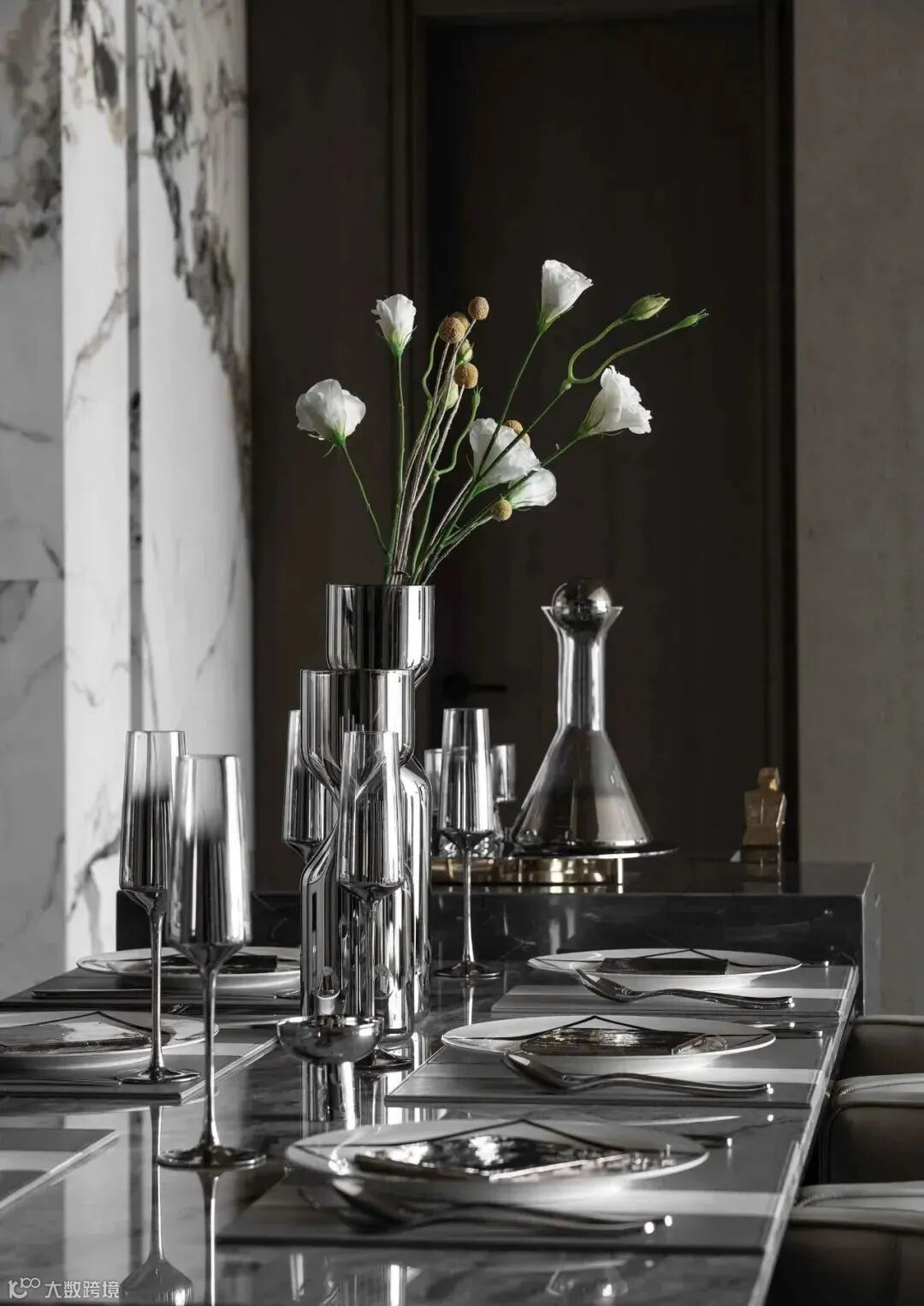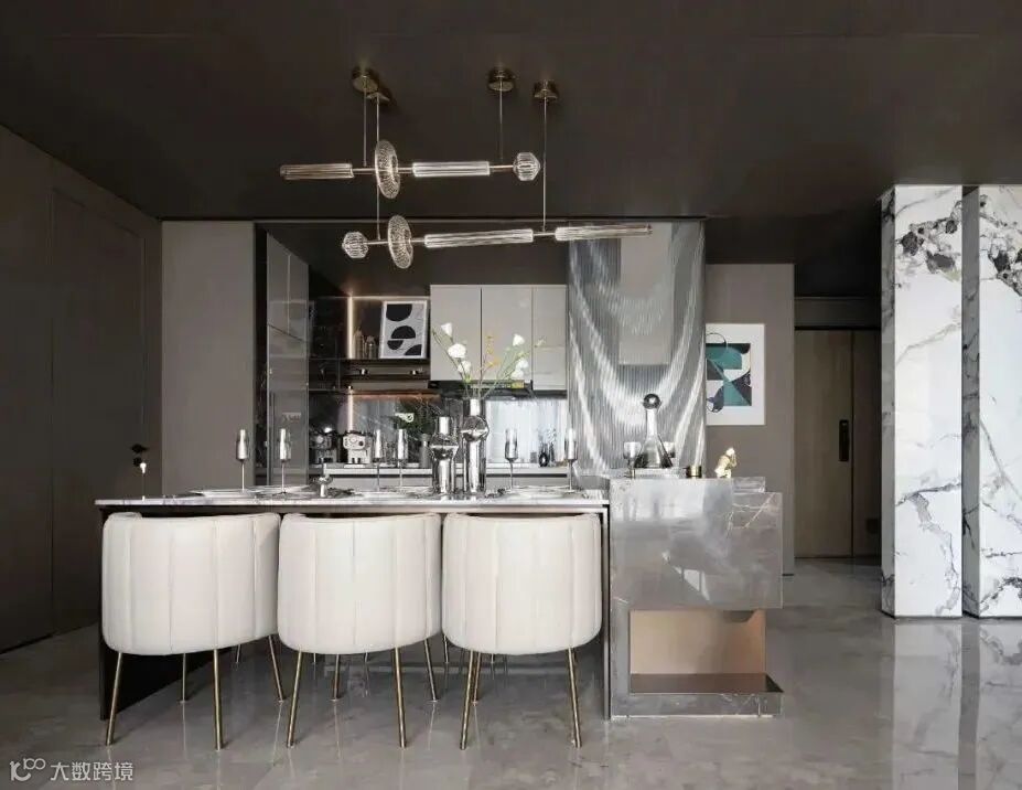 餐厅用金属与大理石镶嵌的酒柜来进行跳脱,设计上别具一格,打破了固化思维设计的沉闷,将艺术和功能完美的融入到这个空间。