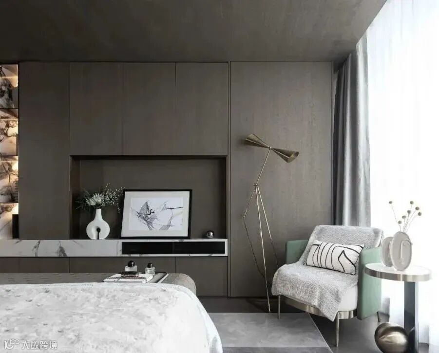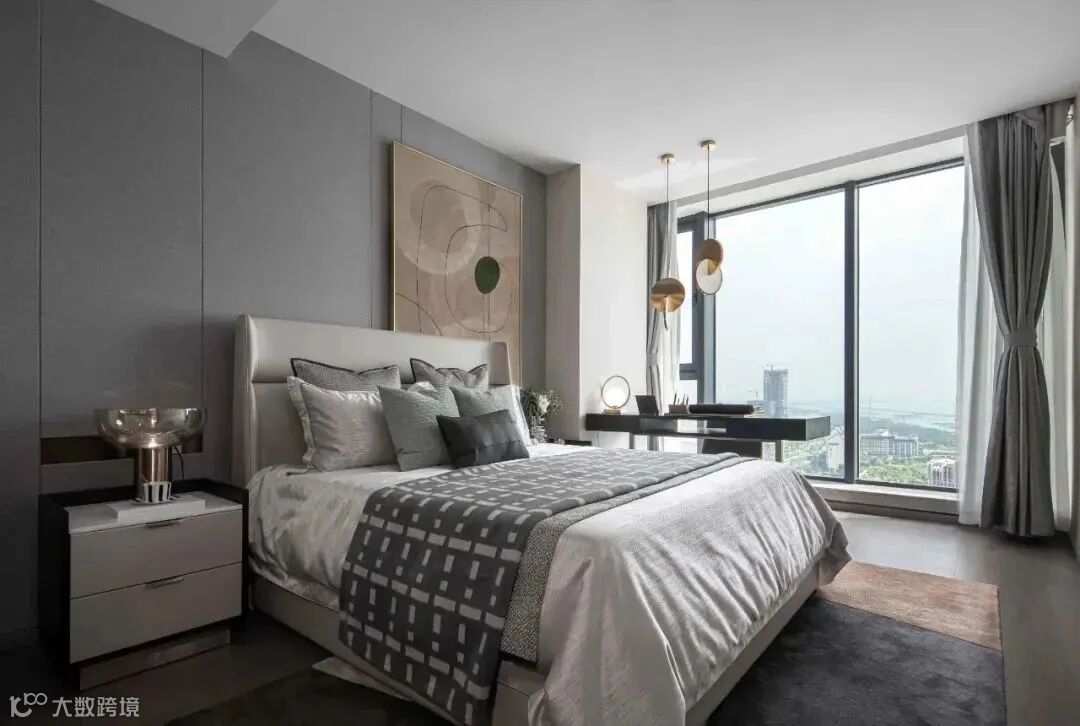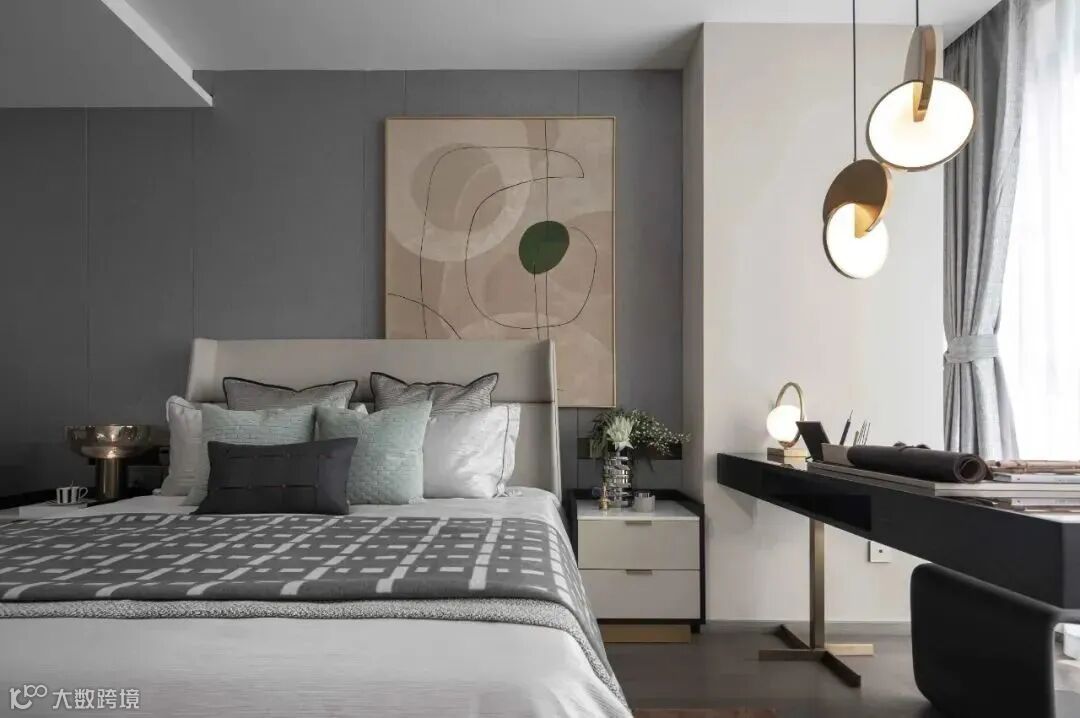 另一间卧室用装饰画来进行衬托,灰色墙面营造出安静沉稳的氛围,二者结合便是这个空间的设计亮点,在这个空间中设计师还运用了很多线条元素,连接着空间的各个部分,将设计美学淋漓尽致的体现,卧室的设计很有层次感。