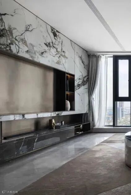 客厅的布局开阔合理,用棕色与灰色作为主色调,衬托这个空间沉稳宁静的氛围,大理石的背景墙呈现出不拘一格的艺术氛围,墙面采用金属进行装饰,使得这个空间的搭配很经典,奢华感体现的淋漓尽致。