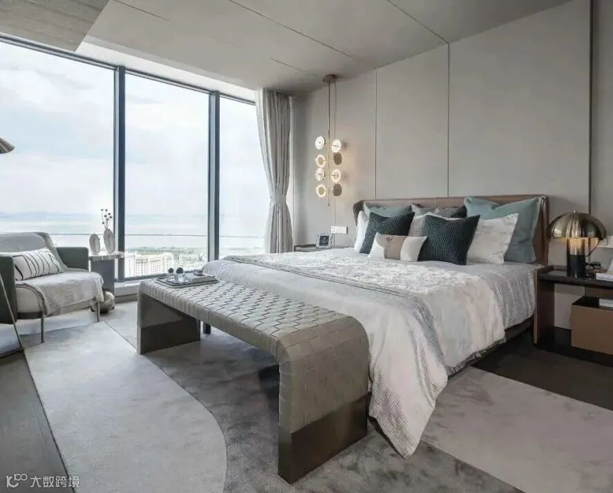 主卧采用木饰面板背景墙,搭配皮革包裹的天花板,看上去质感强烈,同时带一些慵懒的风格,这样的空间设计更加能表达情绪,玻璃衣柜增加了这个空间的通透感,金属吊灯与编织皮革点缀这个空间,品质感和奢华感无一不体现。