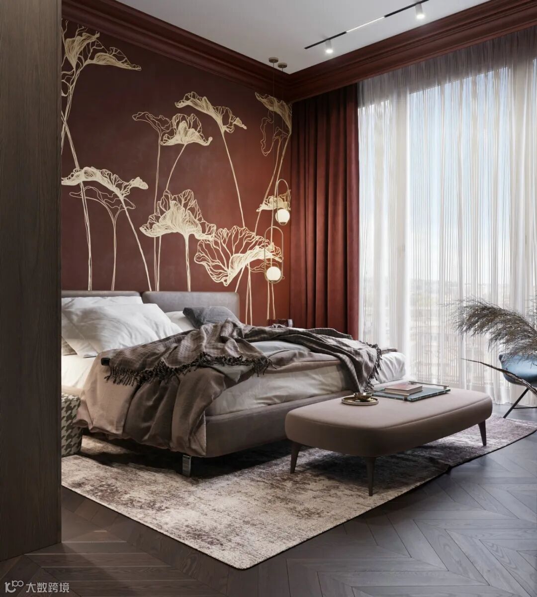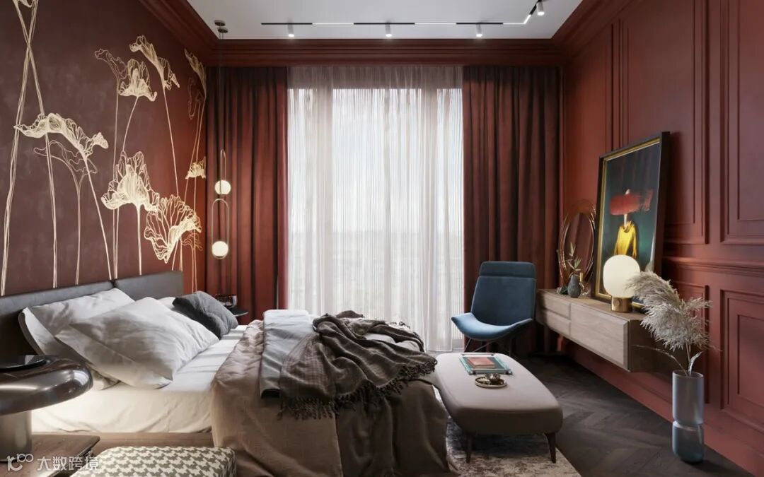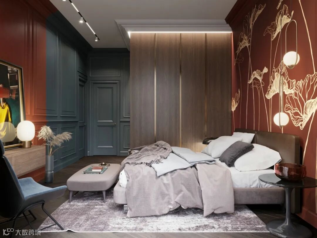 卧室的色彩搭配很吸引人,设计师用冷暖色来打造这样一个温馨、舒适的感觉。大大的落地窗,光线充足,艺术挂画很有艺术性,以现代主义的高度理性,减少陈设的构成元素,于现代极简主义中流露出简约之美。