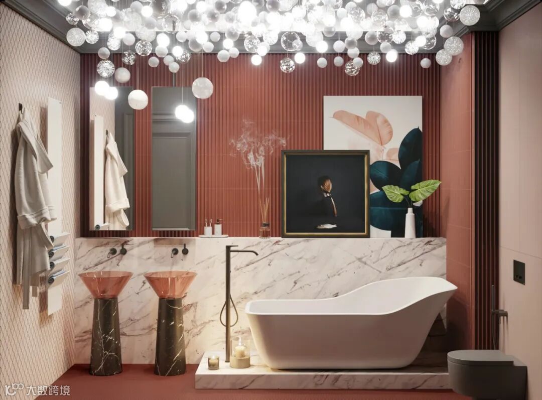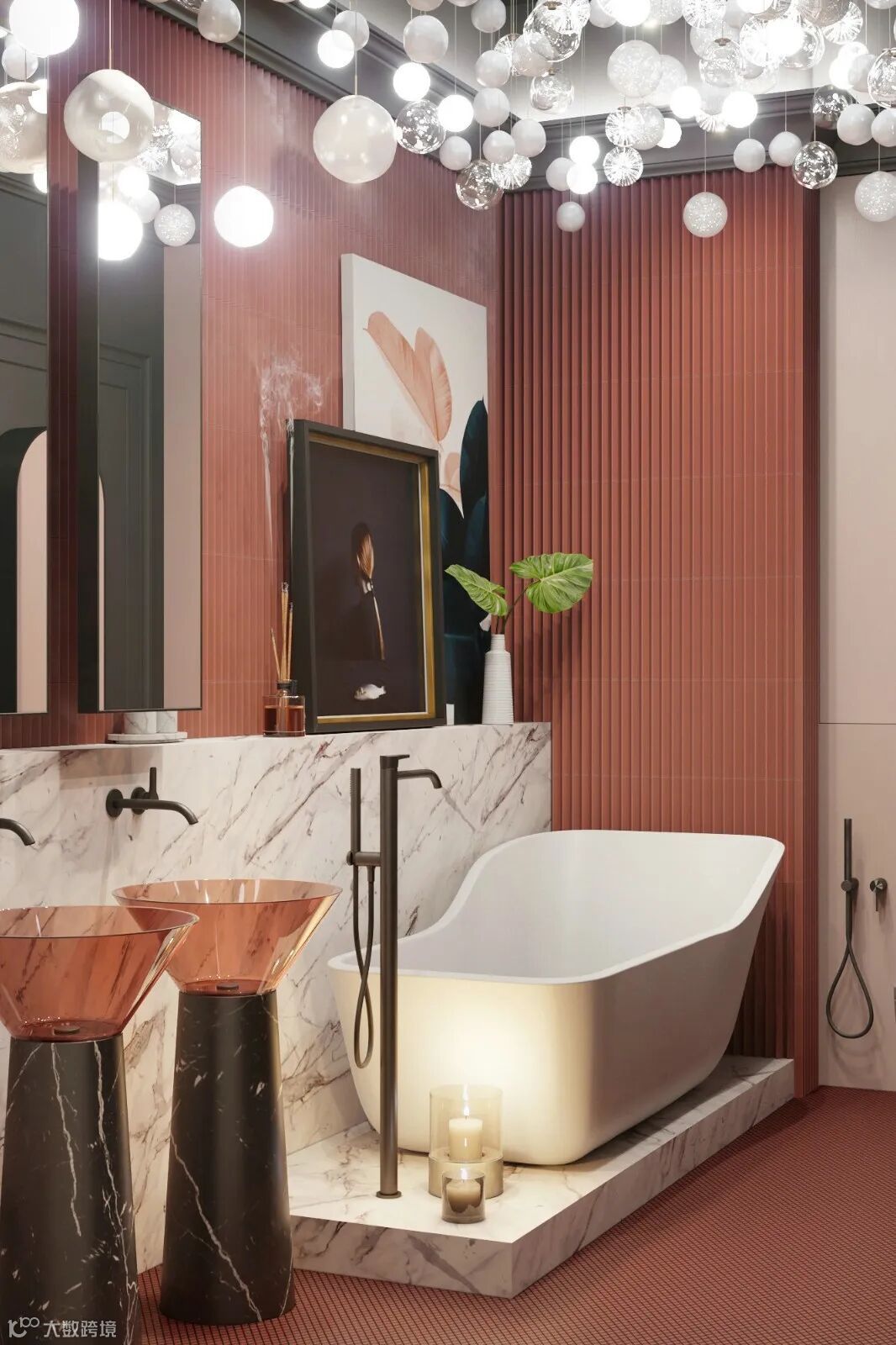 白色大理石+粉色的卫生间,既高级又养眼,同时以工业风的搭配,充满优雅质感,散发出不可抗拒的魅力。