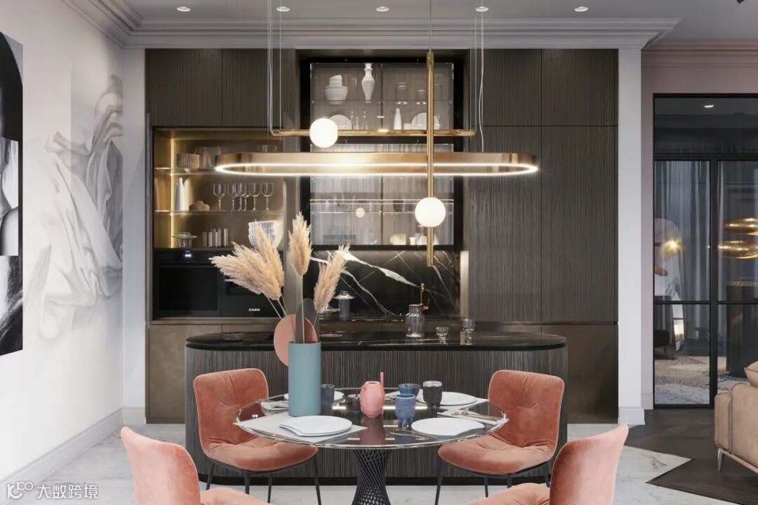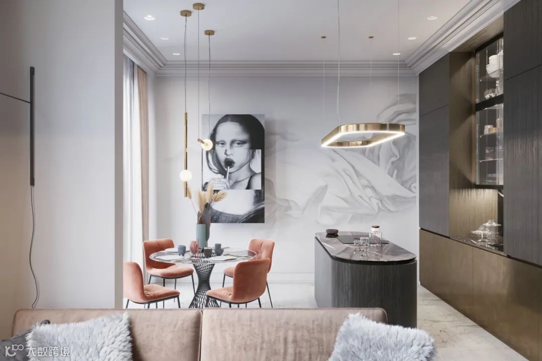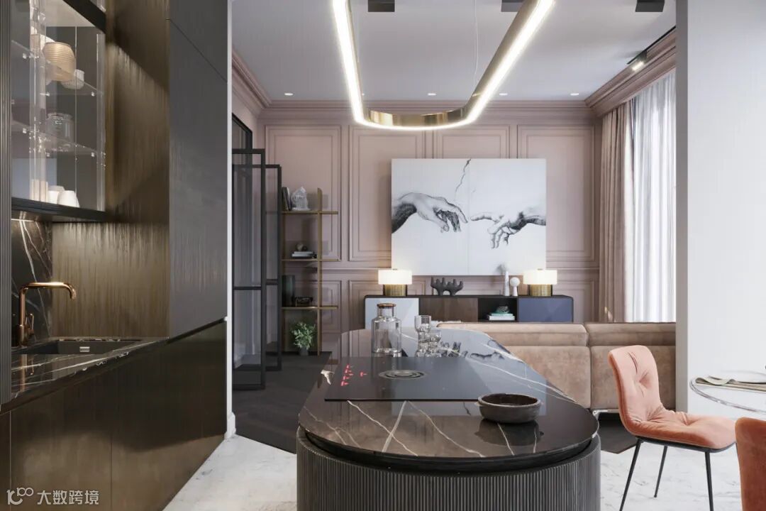 开放式的客厅餐厨一体,厨房深色木色背景,搭配白色大理石地板,金色的艺术吊灯很有氛围,餐椅选择粉色点亮整个空间。客厅的电视背景墙选用浅粉色的石膏板,看起来非常高级,一种情绪很美妙的生活空间。