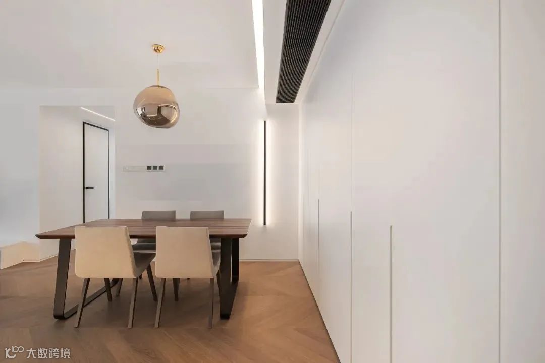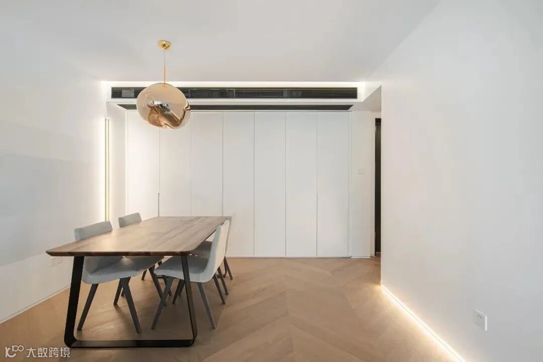 餐厅的隐形踢脚线和中央空调边都嵌了暗藏灯带,竖条装饰灯与顶上的反光灯槽呼应,打破大白墙的单调。简约和简单之间,有时就隔着一条精致用心的线。