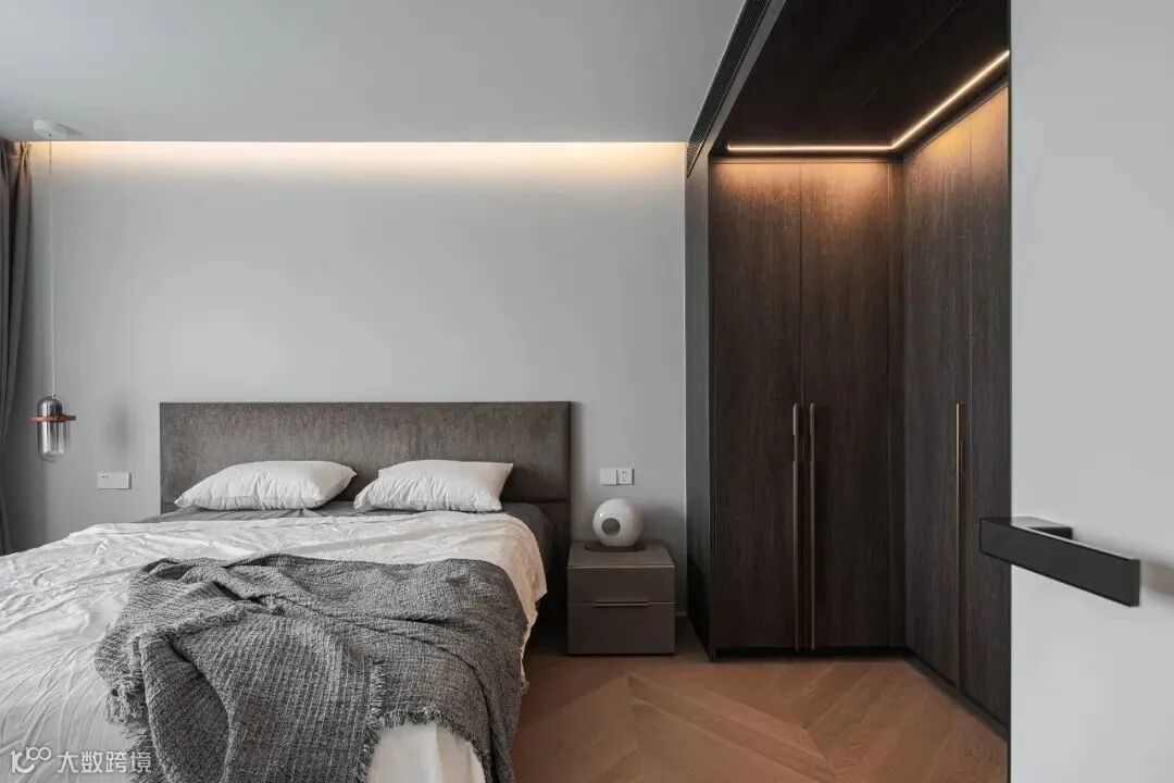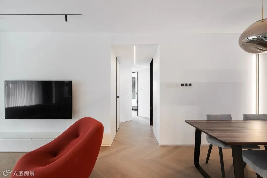 客厅和餐厅中间的长廊,是公区通往私区的主干线。像这样不方正的户型,一种手法就是顺势而为,借着回廊的曲折,做出曲径通幽的效果。吊顶上顺便用线性灯做了个折角,看起来有点像闪电,配上极窄边框门,就十分有未来感。