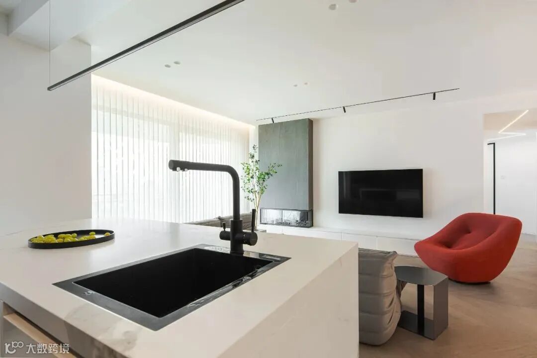 站在岛台边上备餐,还可以跟客厅产生互动,比如与沙发上的人交谈或者看电视。