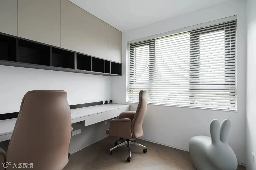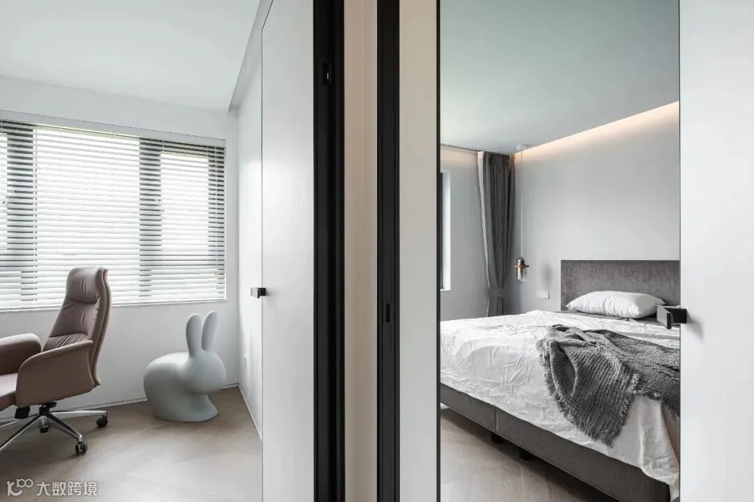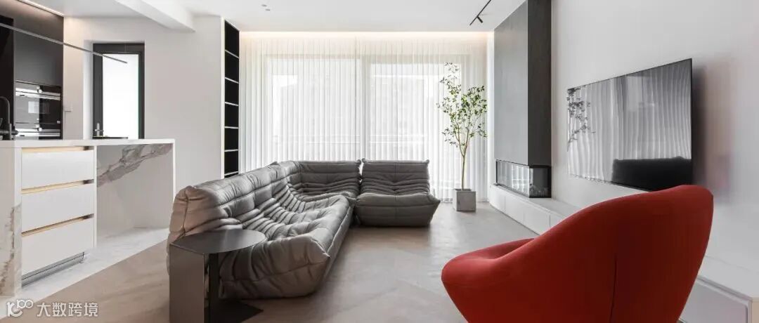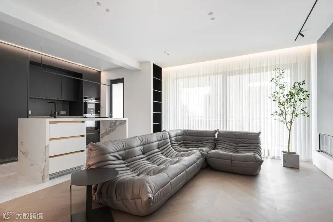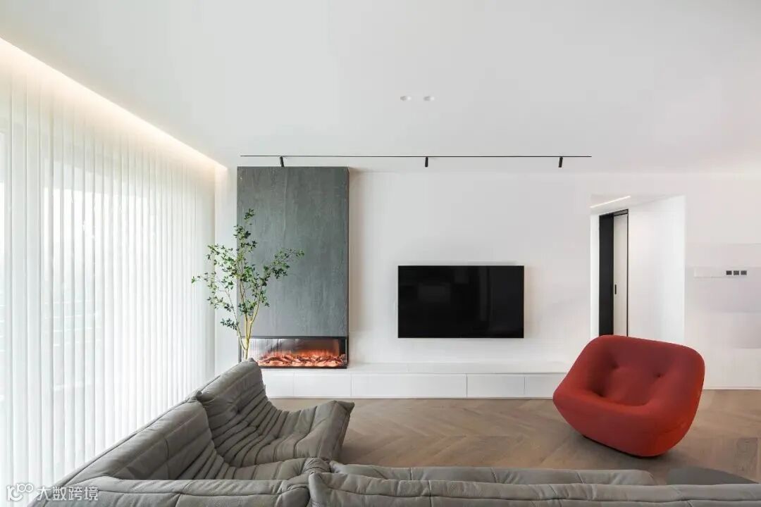 客厅没有选用传统的窗帘,而是更适合极简风格的竖百叶帘,能通过开合、调整百叶角度等方式调整光影效果。