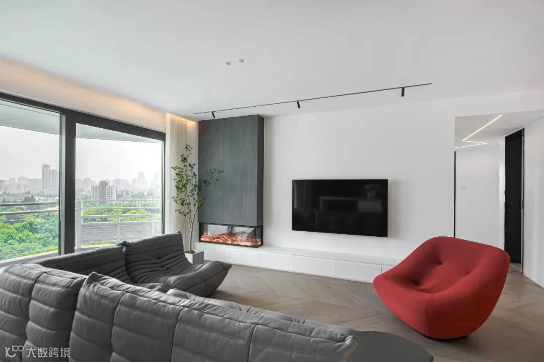 根据与业主的方案沟通,确定家里的核心区域是客厅,于是我们将能看到最好风景的阳台留在客厅。客厅与阳台之间选用的是超大宽幅移门,天气好的时候,可以完全打开,让客厅与阳台打通,室内外自然呼应。