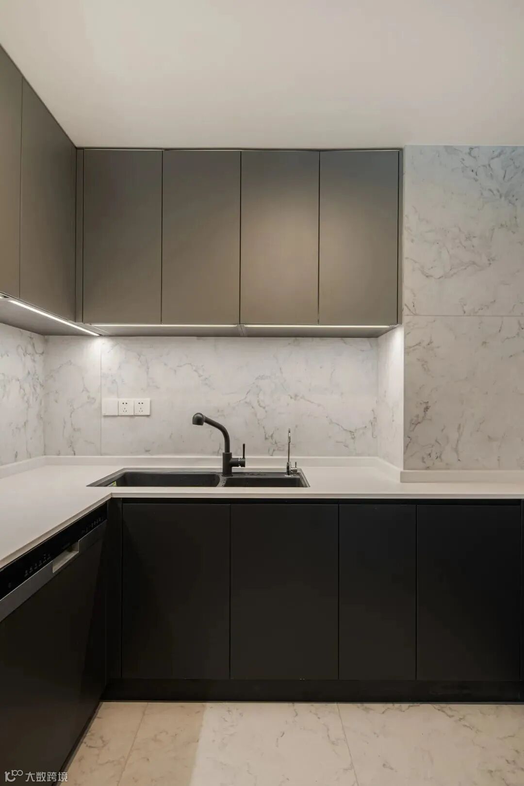 中西厨是业主需求度较高的区域,我们做了大量的功能性设计。中岛整体用岩板制作,纹路连贯,兼具实用与美感。岛台内部利用宽度,左边嵌入水槽与抽屉,右边的镂空方便坐人。在同一个水龙头上,我们集成了自来水和净水两个出水口,也内置了电源,方便在吧台上做简单的烹饪。