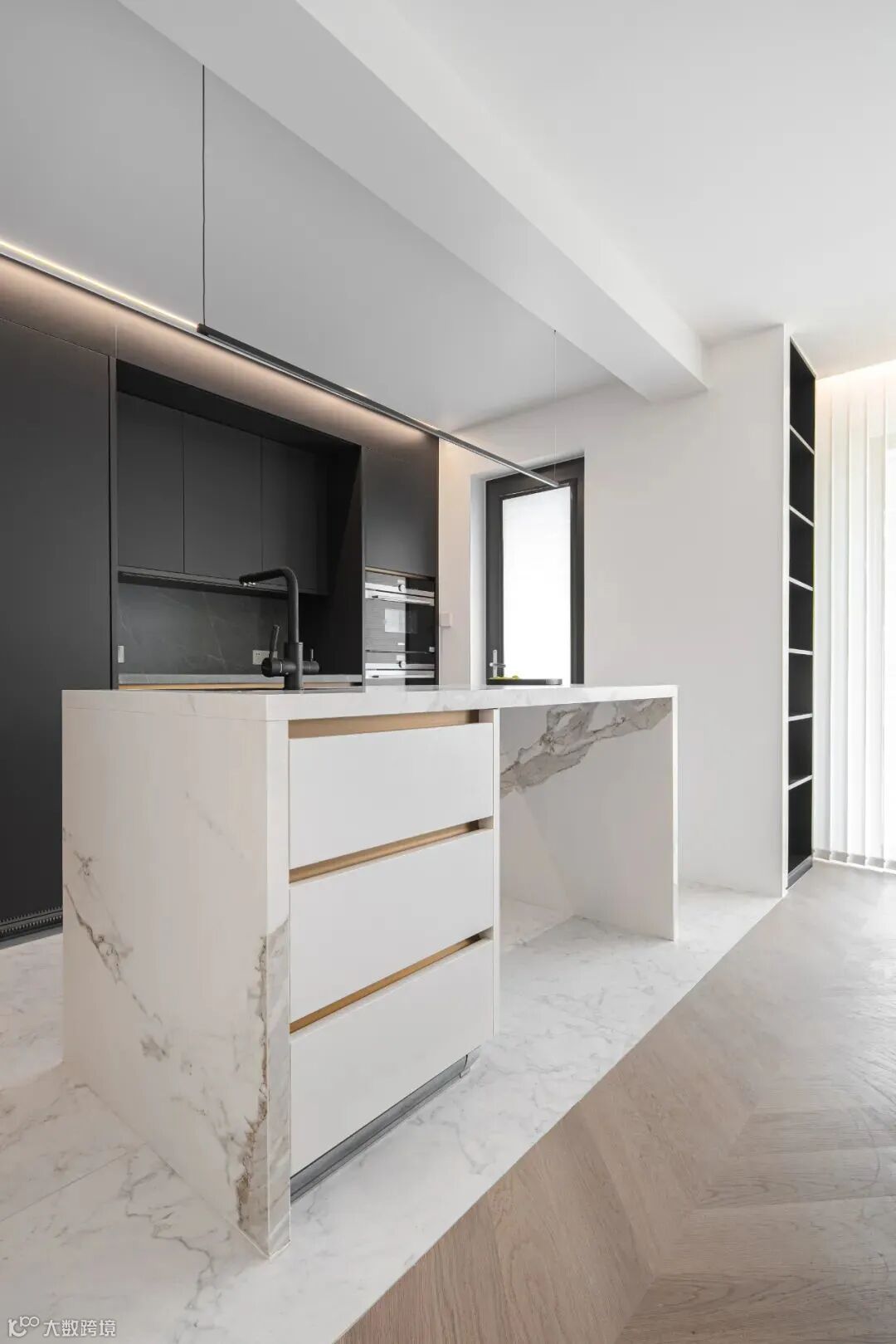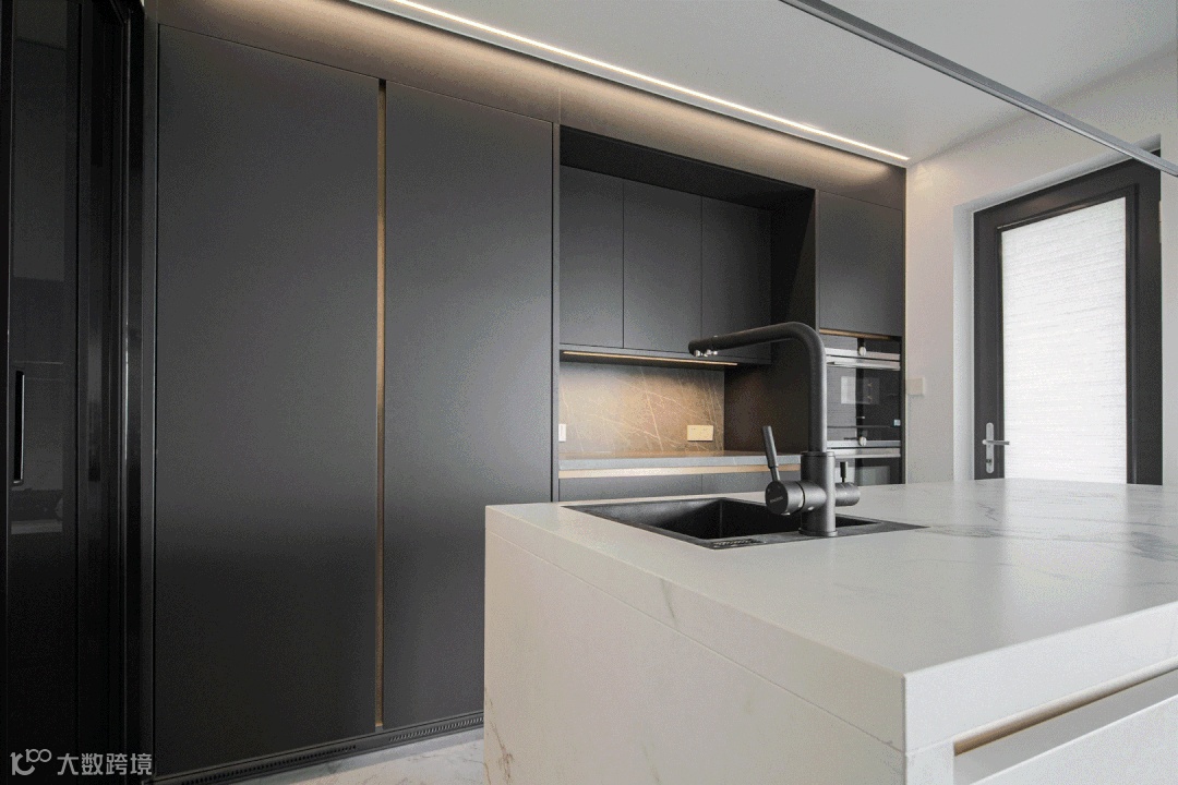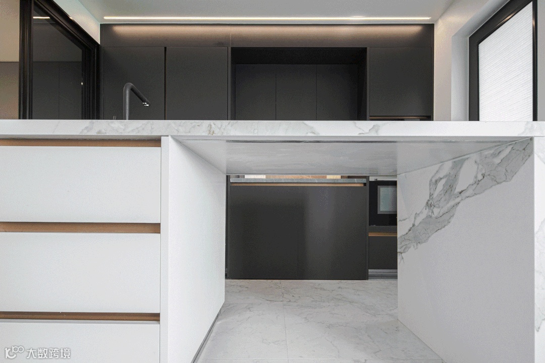 空间上,西厨区还用了个小技巧,在图内能看到——右侧加了一个展示架,就能让厨房和阳台侧在一条直线上,地面和顶面就能拉直,视觉上就自然区隔开了西厨区和客厅。同时,施工上也更好收口。