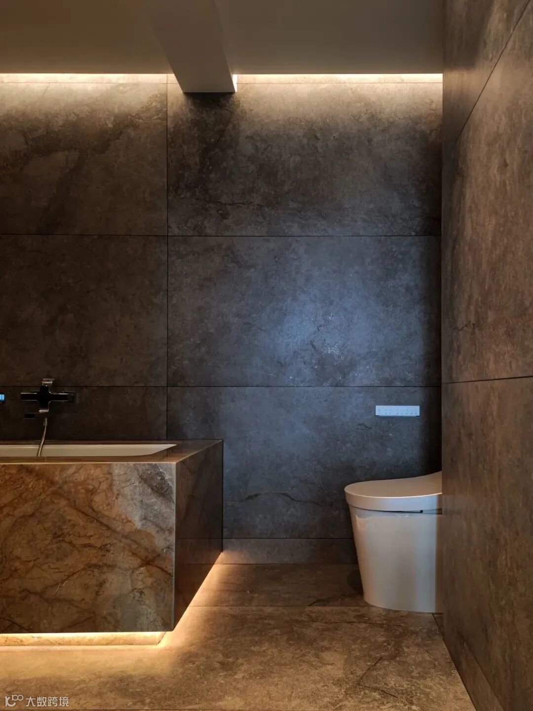 双台盆配置,浴缸与淋浴兼得。浴缸底部暗藏灯带,光线不用太亮,方便夜间起身。试想一下,如果夜里起来要用卫生间,灯光太亮的话,再回床上就睡不着了。