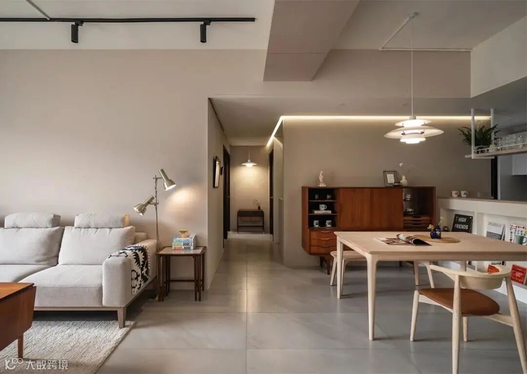亚麻布沙发与杏色背墙牆则以不喧宾夺主之姿