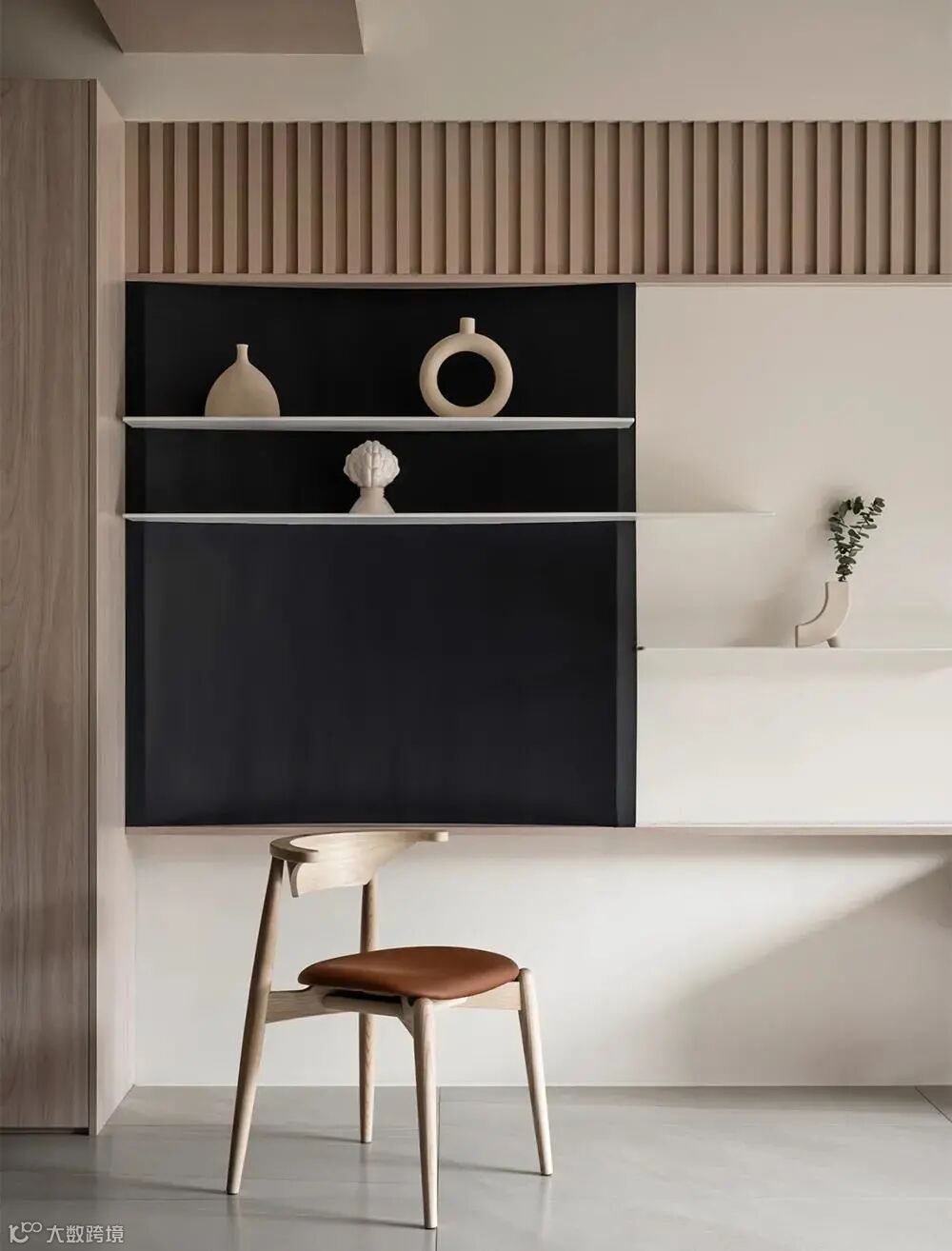微弧黑色木作烤漆崁入三道长短各异白色铁件层板