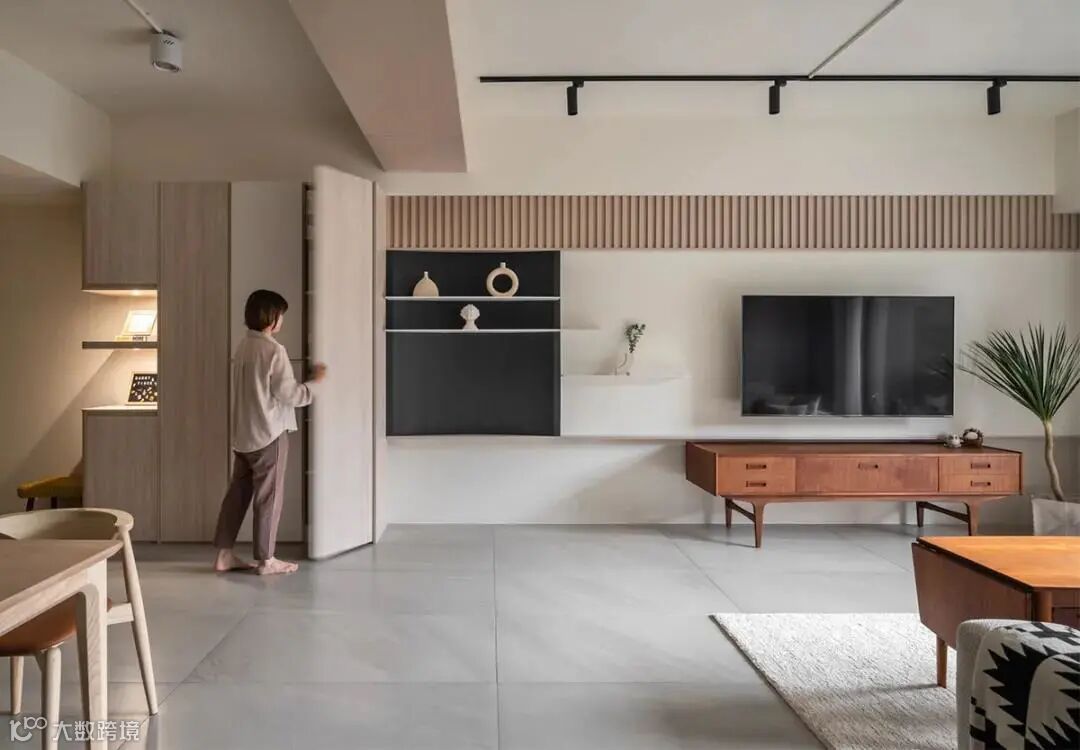 白色漆料铺陈电视墙面,一席木格栅以律动感柔化空间