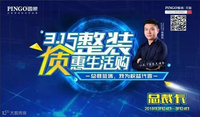 诚信月,PINGO国际开年大惠——3.15整装质惠生活购·PINGO总裁为权益代言,全国四大品牌,五大渠道,900多家分店为3.15打开全新整装格局,活动开展以来,全国分店捷报频频。