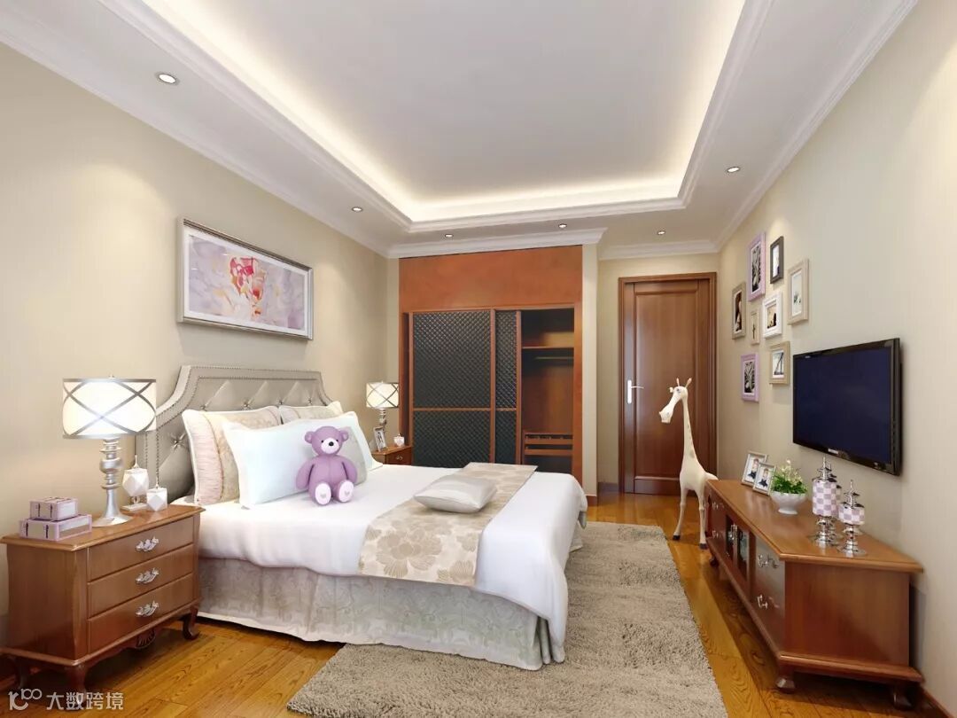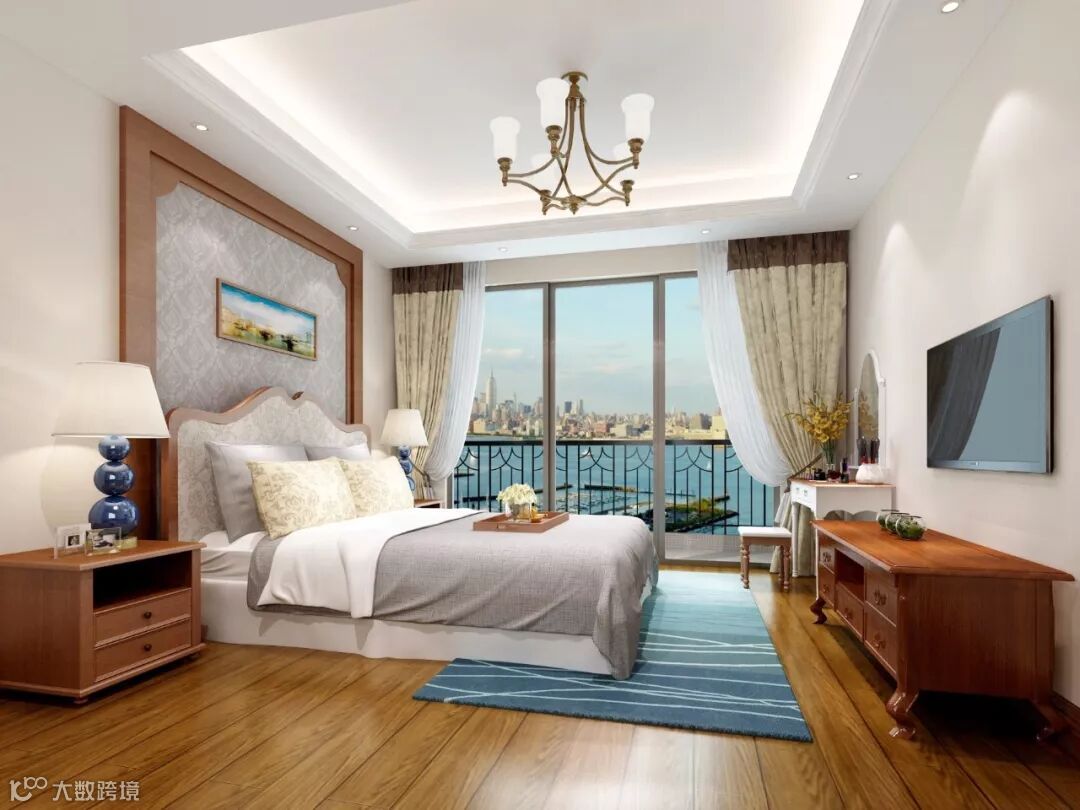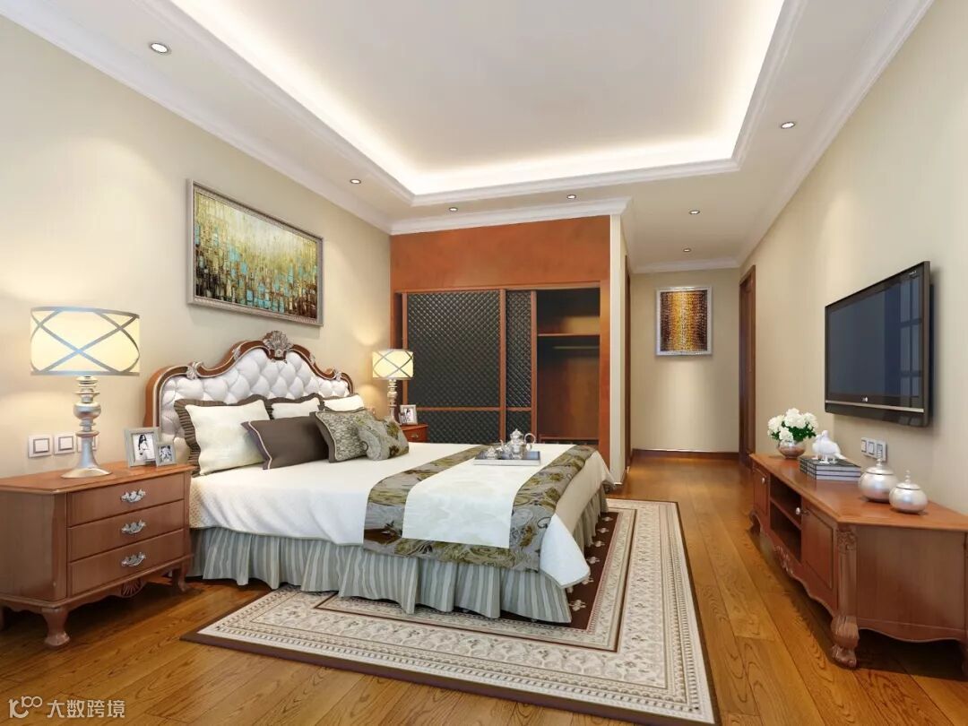 卧室作为私人的休息空间,在装饰上更加简单,美式经典的大家具造型和深咖色,营造出舒适、安心的氛围。背景墙的设计简单精致,处处透着美式风格家居的典雅。