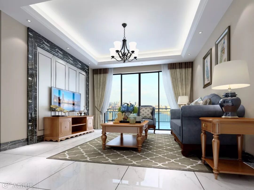 木质的柜子加上墙壁上大理石纹和勾勒格子状的线条,营造有层次感的居室氛围,这是美式风格装修常见的手法。