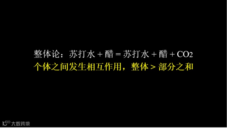 《复杂》这本书里提到一个例子。有一家人,老大舀了一勺苏打水放到一个碗里去,老二舀了一勺醋也放到碗里去,结果这碗里不但有苏打水、有醋,还有了一种新的东西——二氧化碳。二氧化碳从哪里来的呢?来自于个体之间的相互作用。