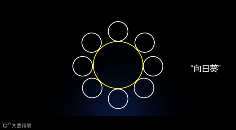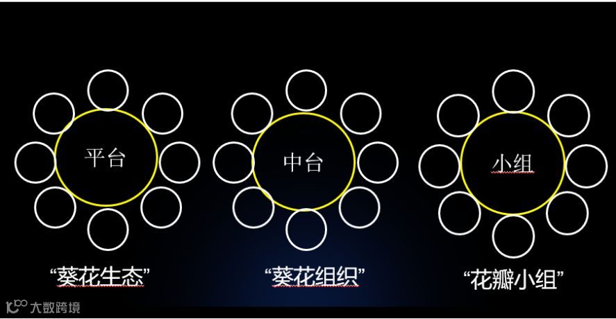 第三,强大的中后台能力。每一个外边的小圈变成了一个主体,中台为它提供各种各样的支持和服务。很像一个向日葵,中间是核心能力,用于支持着每一朵花瓣儿,每一朵花瓣都是一个完整的最小组织单元,由它直接面对这个世界。