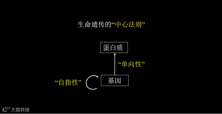 接下来我们来看同一性。从遗传学角度,叫做基因型单向度决定着表现型(基因型 --->表现型)。从父代到子代,这个蛋白质演化的遗传密码存储于我们基因当中。基因就像演化的蓝图一样。下一代生孩子之后,孩子如何能长成这个蓝图?这个蓝图在你的基因里保存着,它告诉你蛋白质是如何遗传的。有一个很重要的顺序,基因决定着蛋白质的演化,而蛋白质无论怎样演化,对基因不能造成影响,被称为单向性演化,即中心法则。