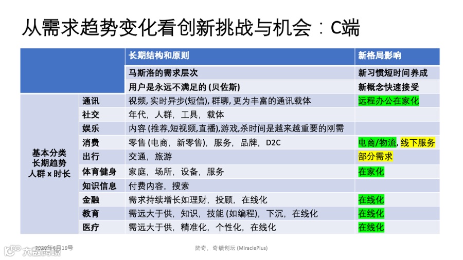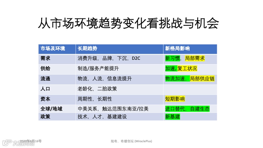 对企业自动化、智能化的新基建,新格局带来的进口替代,我们认为是个非常非常好的机会。产业互联网、物流的流通需求在增加,供应链和资金的流通短期内有可能受到新格局的部分影响。农业数字化、自动化在加速,机会很多。下面的企业数字化的基础建设,由于新格局所带来的全球的格局变化,在中国自建技术生态的需求,和新的基建等等带来了更多的发展产业的机会,对创业者来讲都是好的加速点。