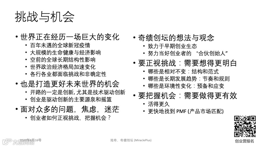 从奇绩创坛的角度来讲,需要正视挑战,意味着我们必须对整个创新生态的全局有系统化且完整的梳理,能把大盘全面的看清楚,同时对新格局所带来的风险,要有充分的分析——这些风险的范围,非确定性的时间区间,帮助每个创业者做好充分的准备。