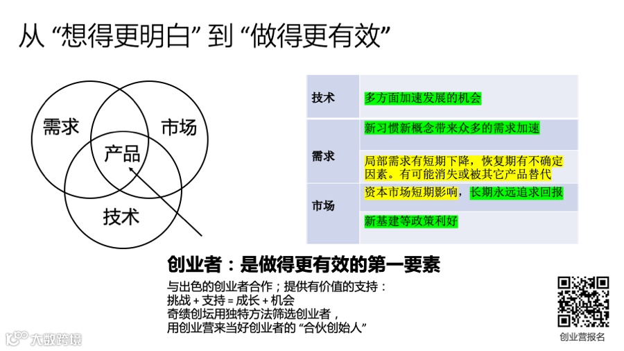 如果我们把刚才讲的三个核心要素的全盘分析统统组合在一起,又回到我们开始这张图,创业哪些是不变的,不变的是用产品去试探市场,变的是技术、需求和市场变化。这里这张表是对我刚才前面分析简单的总结,大家可以看到它带来的更多是机会,局部确实有风险,我们要充分估计风险的范围和时间段,最好能够做到最坏情况的准备,能够灵活地应急。做到这样的话,可以解除我们的焦虑,可以更有信心地从想得更明白,到做得更有效。做得更有效就是核心要抓住这不变的游戏规则,这不变的就是要活得足够长,来不断地快速迭代,找到产品市场匹配。这里最重要的是创业者,创业者做得更有效是最为核心的要素。