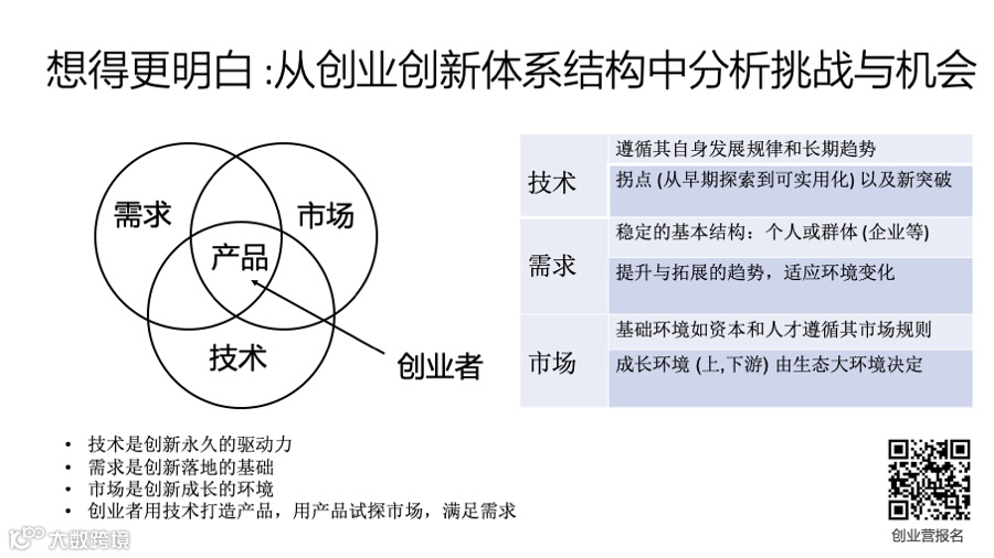 如何想得更明白,起点是要抓住创业创新的体系结构,哪一些是不变的。创业创新有三大要素,这三个要素的有机结合不变。首先是技术,技术永远是创新最永久最强大的驱动力。第二是需求,光有技术没有用,必须有明确的需求,长期且大规模的需求,这是创新真正落地的一个基础。第三是要有市场环境,能够赚到钱,能够有盈利的能力,只有这样,一个好的创业才能长期生长。创业者本身的本质是用技术打造产品,用产品试探市场,来满足需求,所以,创业者核心要做的是要活得够长,可以把产品跟市场这个匹配跑通,这是不变的。
