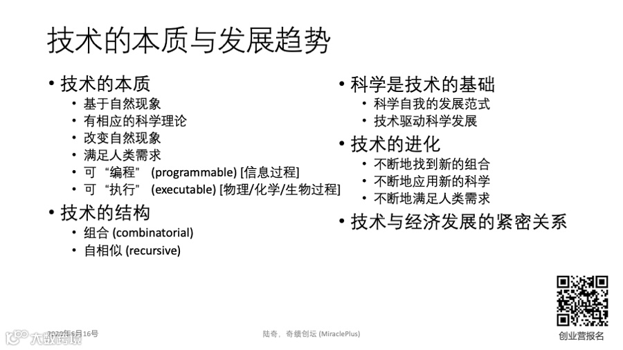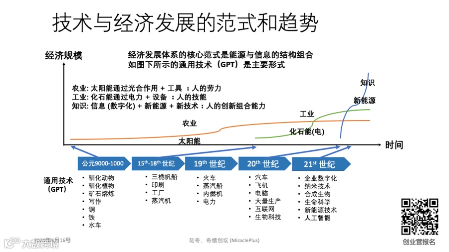 另外,为什么奇绩创坛那么重视创业,因为在这个时代,光靠技能是不够的,你无法创造大规模的价值。创造大规模的价值要靠创新组合。创业是未来的主流,因为这是经济产生价值的核心范式,是重新组合并快速满足人类需求的一种形式。同时技术的前沿,特别是21世纪,大家可以看一下,数字化、材料、生物、生命科学、新能源等,一切技术的前沿,都代表着满足越来越多人类未来需求的能力。