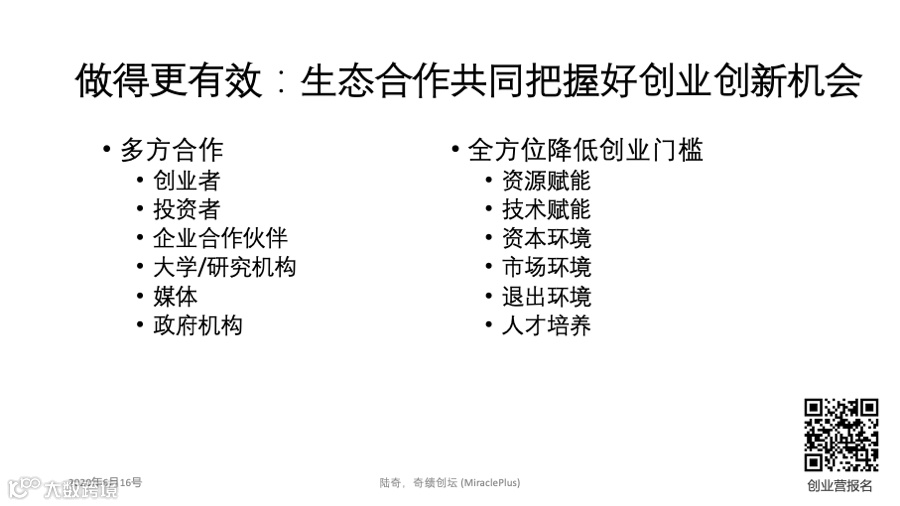 最后我想讲的是,奇绩创坛我们本身也是一个创业公司,我们目前还只有一个六个人的团队,我们需要整个生态一起合作,才可以帮到更多的创业者,让每个创业者在新的格局下,能够更好地正视这样的挑战,把握好机会,多方位地与创业者,投资者,企业的合作伙伴,大学的研究机构,媒体,政府机构等合作。同时我们一起全方位地降低创业的门槛,包括资源赋能,技术赋能,资本环境的提高,市场退出环境的提升和进步,人才的培养等等。我非常相信通过今天这样的互动,我们会形成越来越多的合作机制,通过大家一起的努力,可以把整个中国的早期创业生态做得更加繁荣,让每一个创业团队,让每一个创业者能够更好地正视挑战,把握好机会。