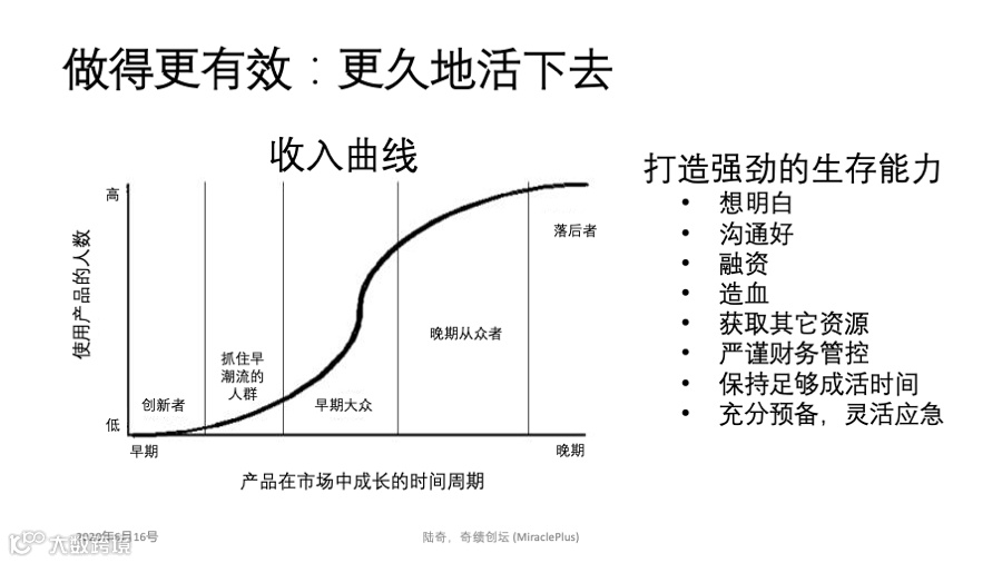 接下来介绍一下我们核心做的两件事,就是不变的游戏规则里面需要加重的这两部分。第一,要更久地活下去,因为任何一个创业公司都有所谓的收入曲线,你在早期没有足够的收入可以养活自己,活下去要靠你的核心能力,这核心能力就是想明白和沟通好的能力,很多程度上是融资的能力,或者是早期造血的能力,让自己能够活的足够长。