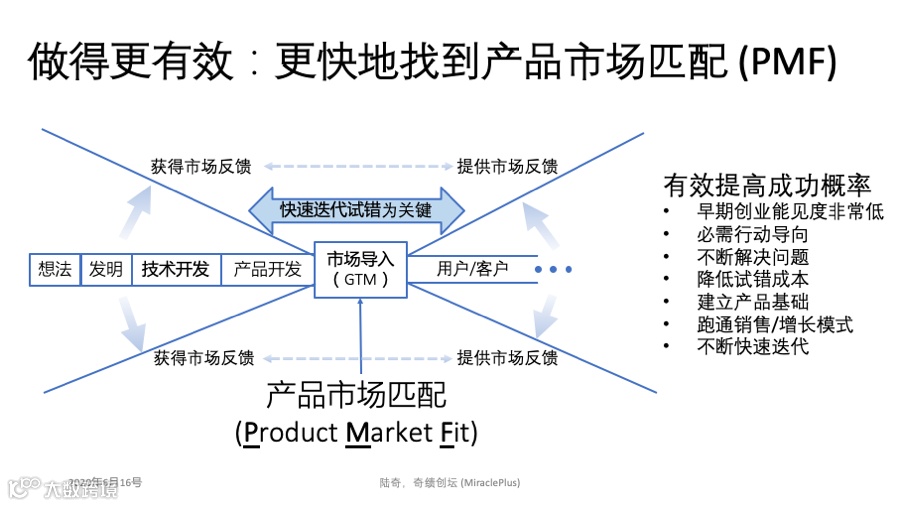 我们做的第二个核心工作点价值更大,就是更快地帮助创业者找到产品市场匹配。找到产品市场匹配是早期创业风险最大、不确定性最大,同时价值产生最大的一个环节。这是一个越来越难以突破的瓶颈口,它是由结构化原因造成的。核心原因是,随着技术的普及,技术的发展,人才提高,好的创业想法越来越多,好多基于这些想法的发明也越来越多,技术开发也做的越来越好,越来越快,产品开发也做得越来越好,越来越快。但是,市场切入还是一样的瓶颈口,因为每个用户一天只有24小时,因此这个瓶颈口越来越难突破。唯一可以提高成功概率的,只有加速迭代,尽可能用最低的代价,最低的时间代价,最低的资本代价,来找到早期的市场反馈,这是非常核心的,我们跟创业者每周一起做的,大部分也是在这里。