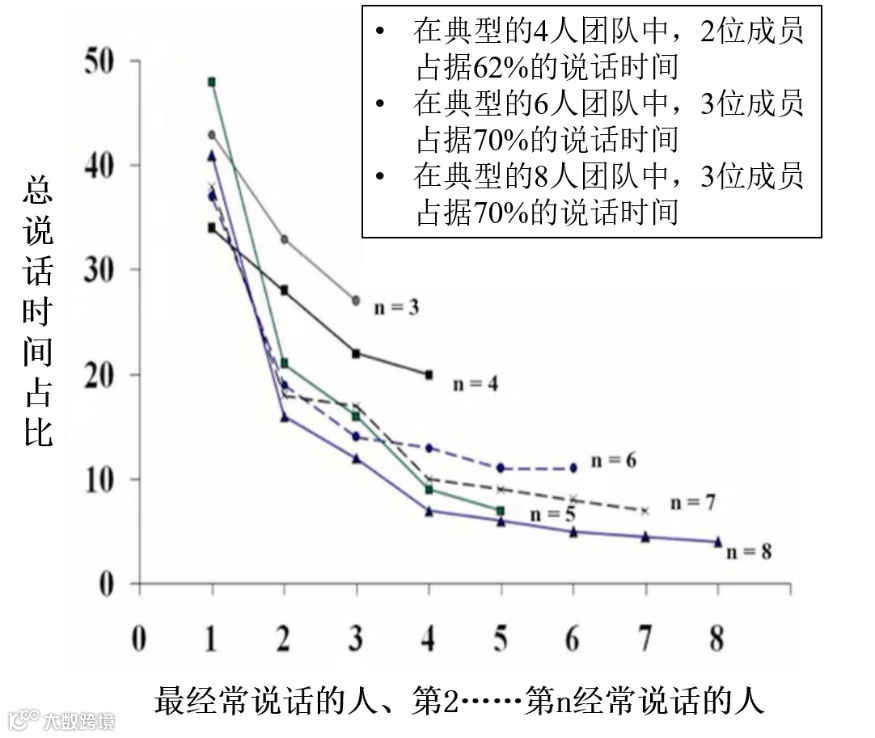 管理学家Shaw在《团体动力学》一书中做过一个研究,一支平均8人的团队,有3位团员会占据70%的说话时间。并且研究表明,说话的多少往往和专业性以及能力并没有相关性。