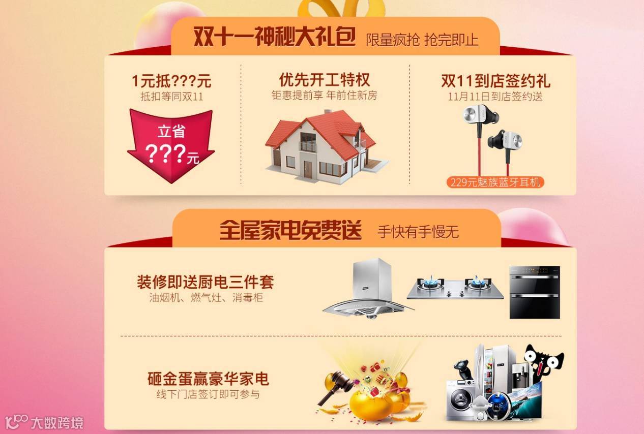 10月1日至11月10日,可在PINGO天猫旗舰店1元预定双11大礼包,提前享受等同双11当天特权定金抵扣,同时获得家装工程款全额补贴的限定名额和烟灶消厨房三件套。双11当天到门店签约认购,还可以参与砸金蛋赢家电等多重优惠。在活动期间,凡收藏PINGO天猫旗舰店,分享双11活动或者购买任意商品,均可获得幸运大转盘抽奖机会。奖品包括ofo小黄车、家装特权、支付宝红包等。小伙伴赶快上官网,瞄到喜欢的家装风格,赶紧根据上面的优惠信息,争取把所有福利都拿到手!