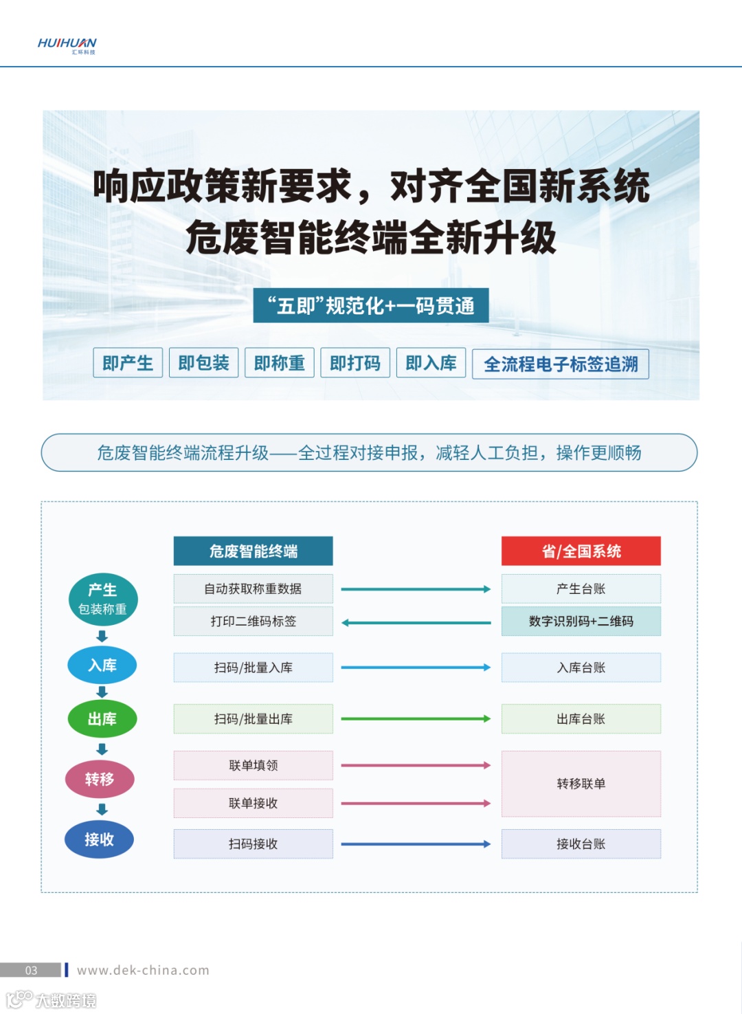 响应国家危废监管新要求,对齐全国危废管理新系统,以“五即规范化+一码贯通”为核心,通过危废智能终端升级,实现危废全流程电子标签追溯,减轻企业人工负担,让操作更顺畅、合规更高效。