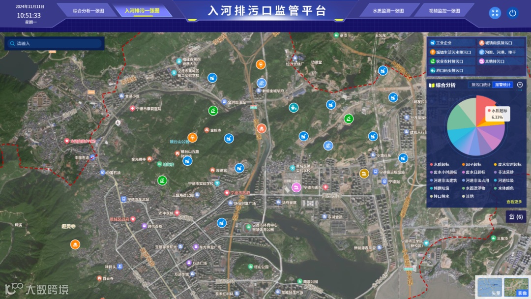 以大数据、云计算、GIS、人工智能、可视化等技术为支撑,将水质监测、视频监控等大量环境信息加以整合,建立入河排污口数据库,并可视化手段进行集中展示,辅助领导决策,最终实现信息资源共享化、管理决策智能化的目标。